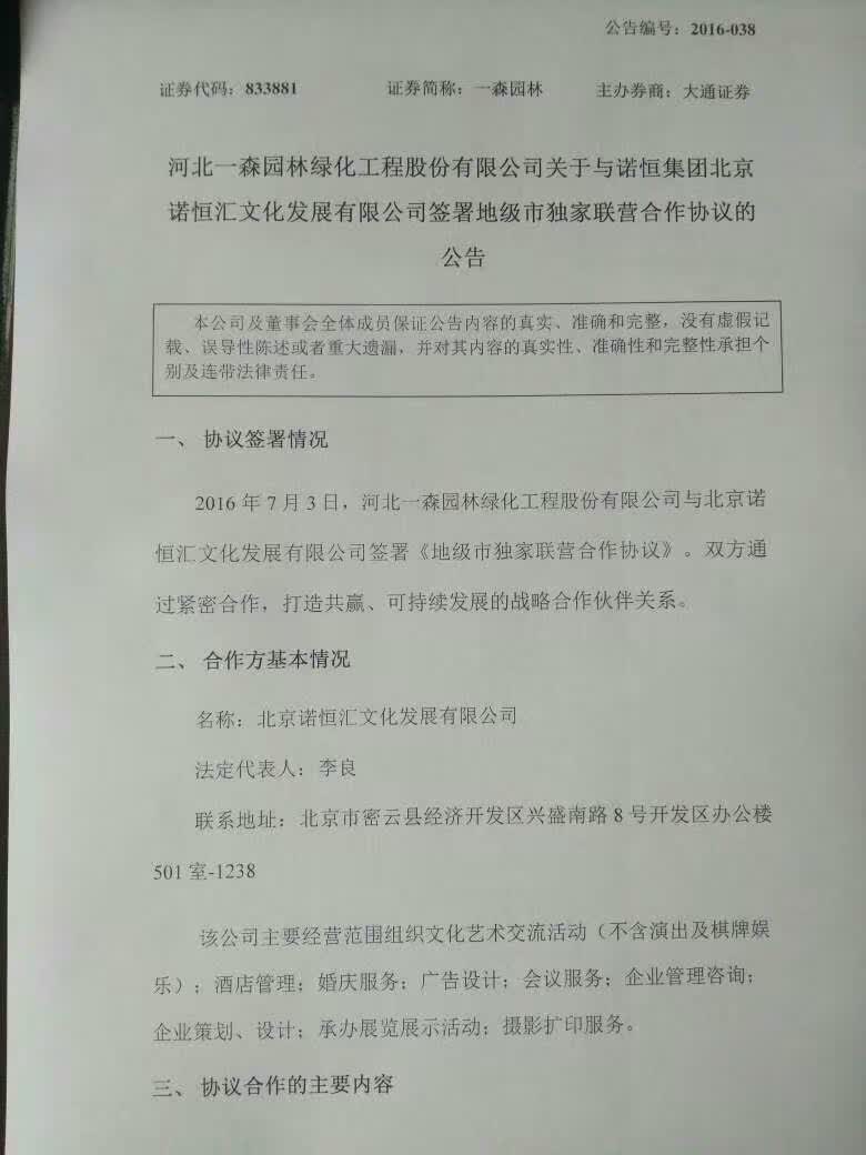 河北一森園林綠化工程股份有限公司關(guān)于與諾恒集團(tuán)北京諾恒匯文化發(fā)展有限公司簽署地級(jí)市獨(dú)家聯(lián)營合作協(xié)議公告