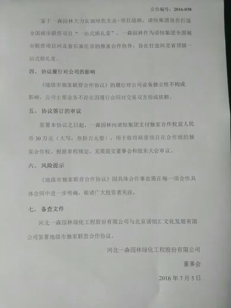 河北一森園林綠化工程股份有限公司關(guān)于與諾恒集團(tuán)北京諾恒匯文化發(fā)展有限公司簽署地級(jí)市獨(dú)家聯(lián)營合作協(xié)議公告